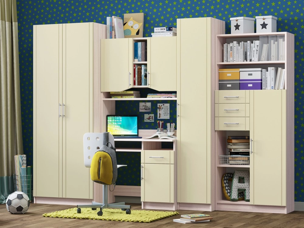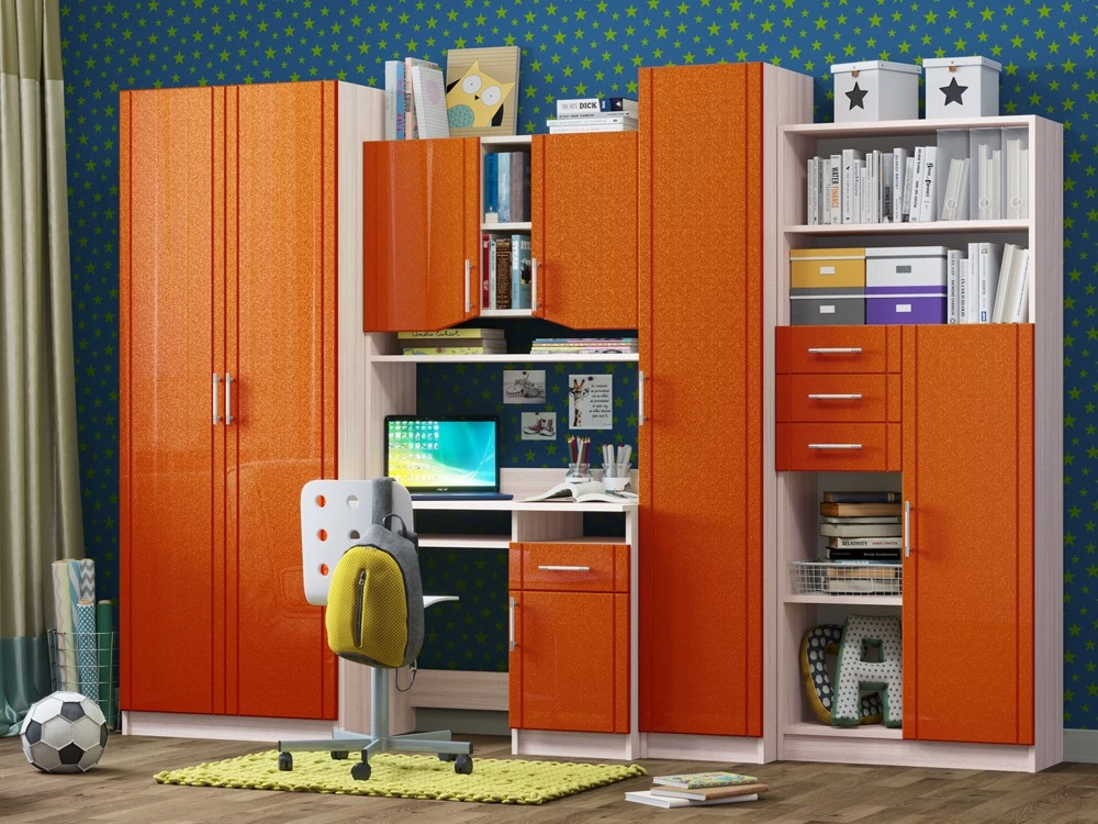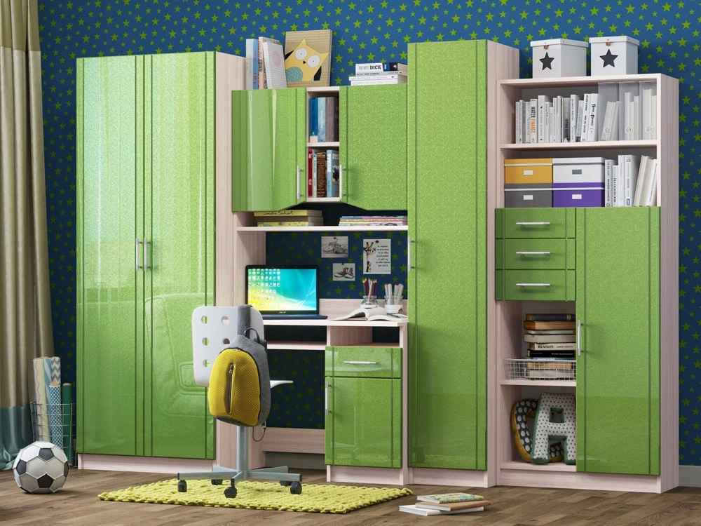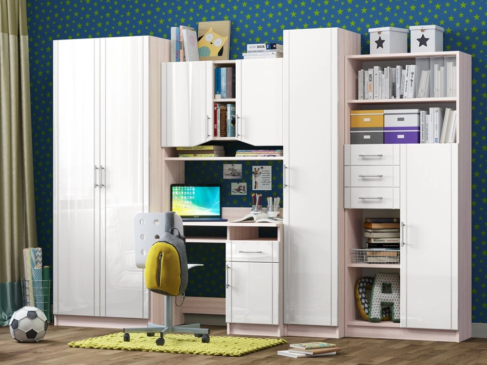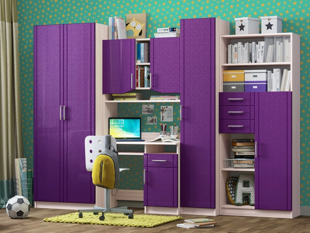 Детская Юниор МДФ – практичный и экономный вариант. Подойдет, как и для подростка, так и для маленьких хозяев комнаты. Вместительные отделения шкафа и большое количество ящиков помогут поддерживать порядок в комнате. Внутри шкаф оснащен штангой для плечиков и огромным количеством полок, что позволит поместить большое количество одежды.