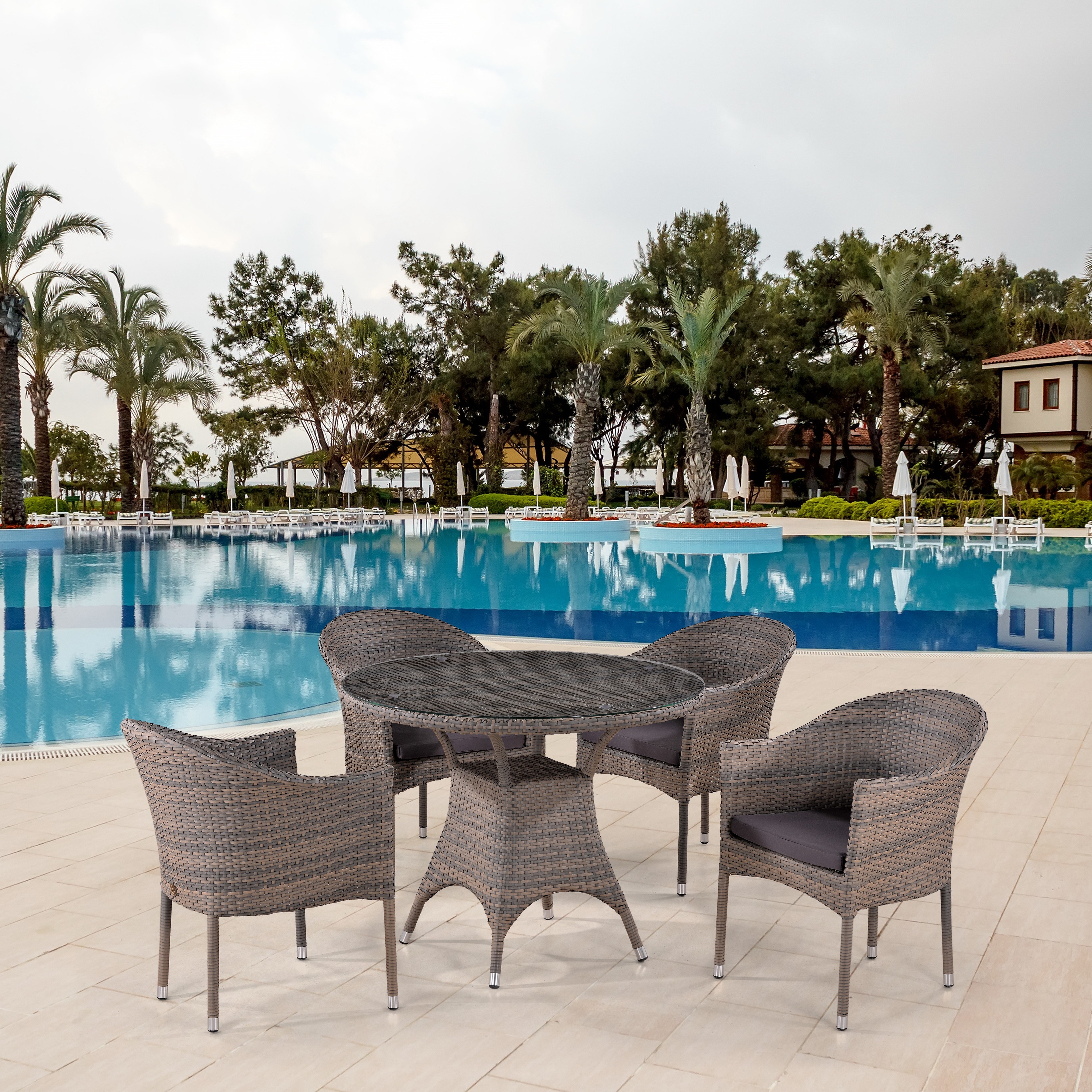 Стол: D96xH74 см, Стекло: закаленное - 5 мм, Кресло: W57xD61xH79 см, Каркас: сталь, Материал: искусственный ротанг Цвет: Pale.
