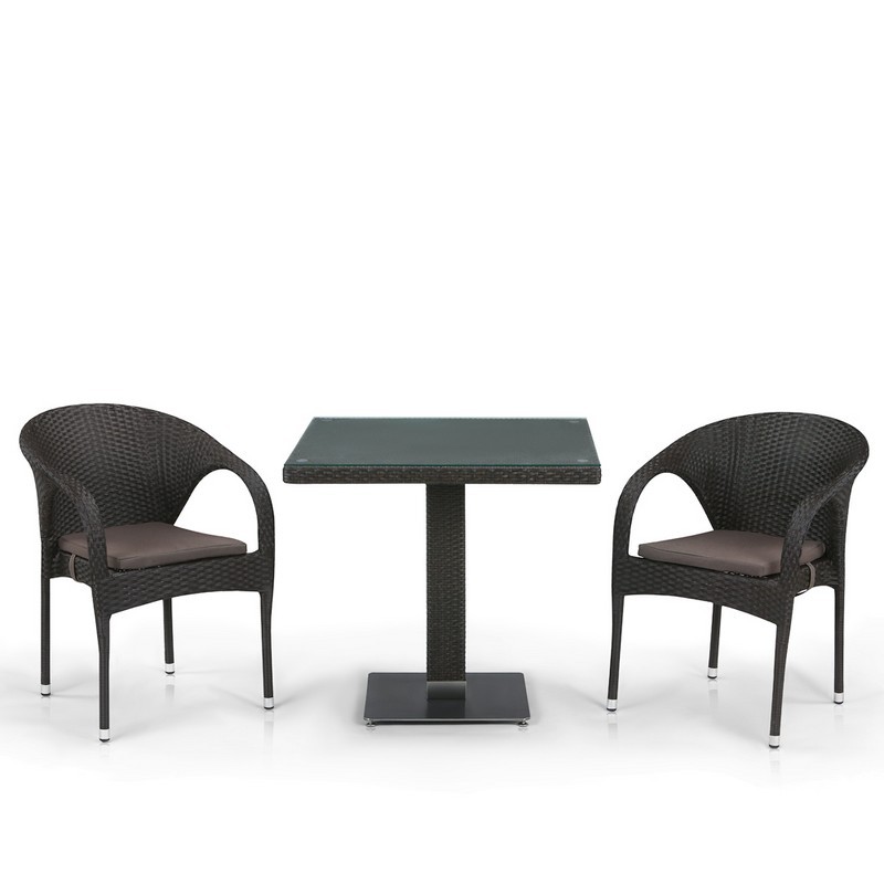 Стол: L70x70xH74 см. Столешница: закаленное стекло-5мм, цвет - бронза. Кресло: W59xD63xH81 см. Каркас: сталь. Материал: искусственный ротанг. Цвет: Brown. Объем и вес комплекта: 0,76 куб. м, 54 кг.