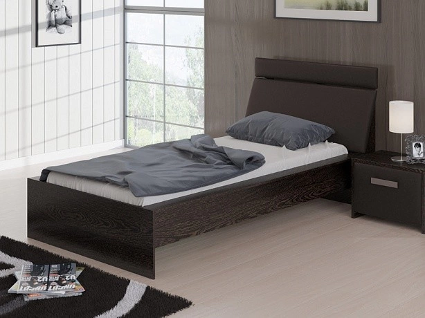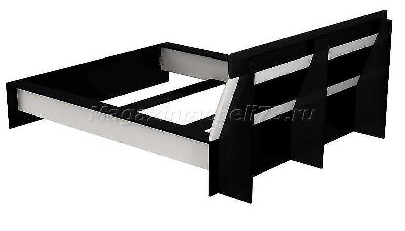 Стильная черно-белая кровать с наклонной спинкой. С обратной стороны спинка усилена ребрами жесткости. Каркас кровати выполнен из ЛДСП, а мягкая вставка на изголовье обита экокожей класса "Люкс".